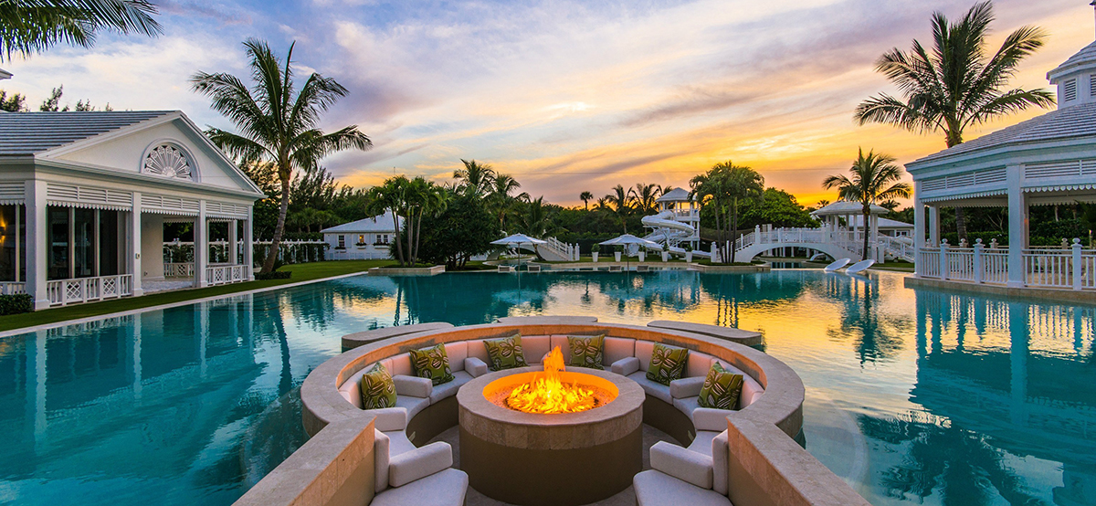 site furnishings, brick paving, rock waterfalls, and landscape lighting.